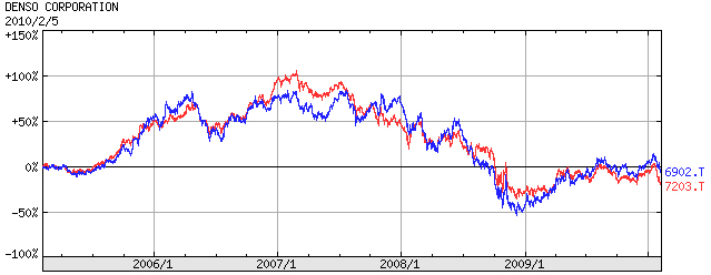 青がデンソー。赤がトヨタ。ここ5年の株価推移。トヨタと一心同体。