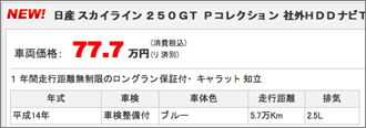 たま〜に、中古車検索でワタシが今乗るV35スカイラインと同じグレード&同じ位の走行距離の車両を検索して昨今の市場価格ってモンを眺めてみたりします。・・・ええ、殆どの場合、憂鬱になることうけあいですがぁ(爆)。